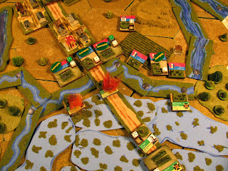 Here is the end of the Prussian 1000 turn the 1st Brigade is still advancing against the Wurttenburg Div and the 2nd Brigade failed on its attempt to cross the stream and is exhausted but the 7th Brigade has just entered the board.