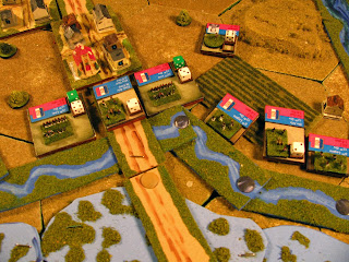 Here are the Prussian forces. The dice show the unit strength and also are a quick identifier by color of the unit functions. White dice are normal infantry, artillery or cavalry, green show skirmishers, blue show shock troops and yellow indicate militia. From left to right the 1st Brigade, 2nd Brigade, 7th Brigade and the 8th Brigade.